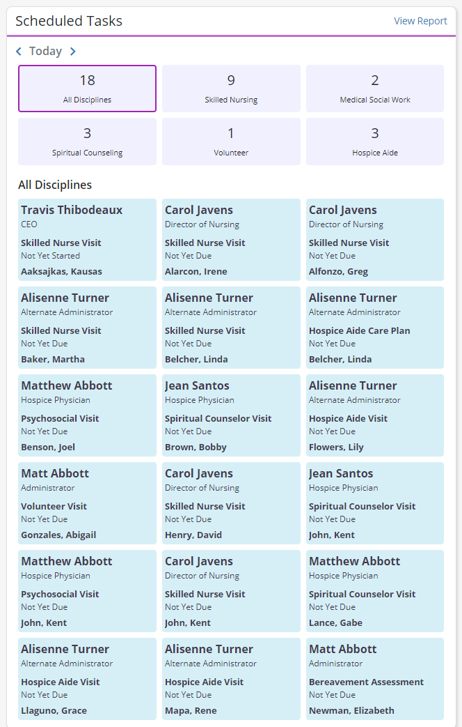 The top portion of the tile displays the total number of scheduled tasks for each discipline. Task tiles for of all disciplines are listed under the discipline totals. Each task tile shows the assigned user’s name and title, the type of visit scheduled, the real-time visit status and the patient’s name. Click on a task tile to open a task. Click View Report to view the full Scheduled Tasks report.