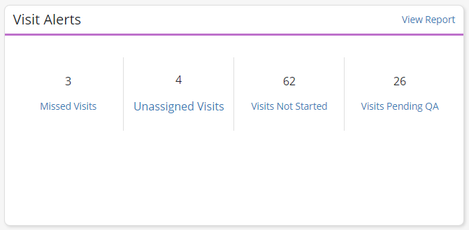 The Visit Alerts tile displays the total number of missed visits, unassigned visits, visits not started and visits pending QA. Click on any of the visit tiles to view the Visit Alerts report filtered by the selected visit type, or click View Report to open the full report.