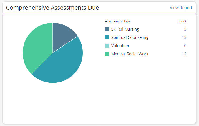 On this tile, the pie chart provides an at-a-glance view of how many assessments for each discipline comprise the total number of comprehensive assessments due. Hover over any section of the pie chart to view the number of assessments due and the percentage of due assessments that fall under that discipline. Click on any section of the pie chart or select a number next to any discipline to view the Comprehensive Assessments Due report filtered by the selected discipline.