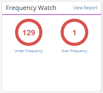 The Frequency Watch tile compares the number of scheduled versus ordered visits and displays a breakdown of tasks scheduled over or under the ordered frequency. Click on Under Frequency or Over Frequency to view the filtered Frequency Watch report, or click View Report to open the full report.