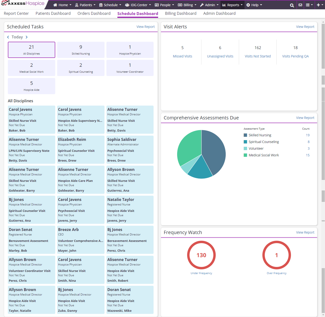 Axxess Hospice now provides a robust Schedule Dashboard that tracks and displays scheduling data in real time.