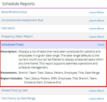 To access the Scheduled Tasks report, navigate to the Report Center under the Reports tab. In the Schedule Reports section, select Scheduled Tasks to open the report. Click Learn More to view information about the report.
