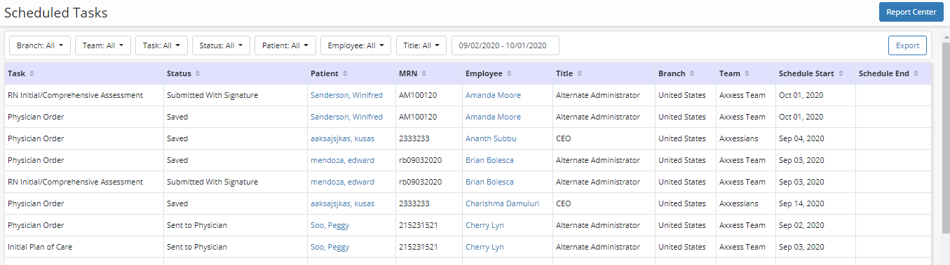 To view the Scheduled Tasks report, users must have permission to view and export schedule reports in Axxess Hospice.