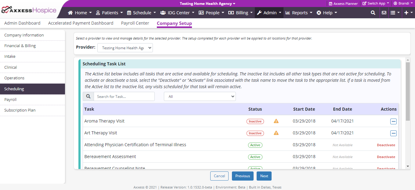Axxess Hospice now enables users to identify in Company Setup which tasks should be available for scheduling. Organizations can set different task lists for each provider at their organization to accommodate their respective program needs.