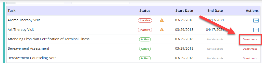 To deactivate a task, click Deactivate under Actions and enter the date on which the visit will no longer be active. The task will be deactivated at midnight (CST) on the selected date. Tasks can only be deactivated for future dates.