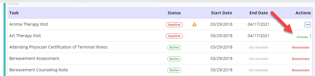) will appear next to the task status. Hover over the caution symbol to view the date that the task will be inactive. Tasks that are already scheduled at the time a task is deactivated will remain on the schedule and can be manually deleted if necessary.