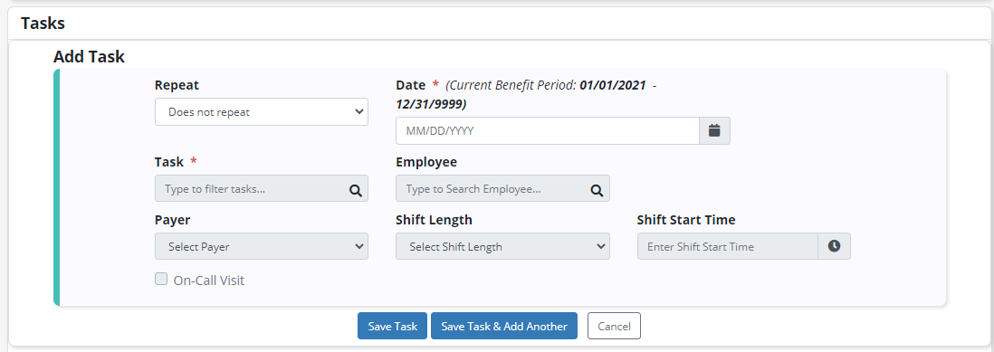 When adding a task at the patient or employee level, the date of the task must be selected first to ensure that the selected task will be available for scheduling on the date selected. Once the date has been selected, tasks will become available for the user to select. Once the task has been selected, the remaining fields will be available to complete.
