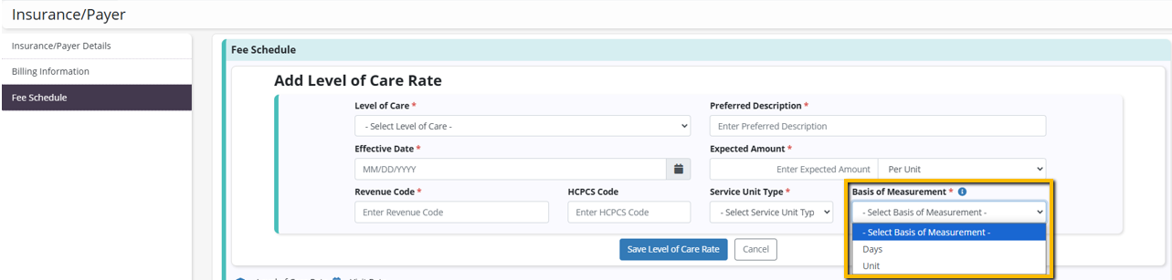 On the Fee Schedule tab, users can select Days or Units from the Basis of Measurement drop-down menu.