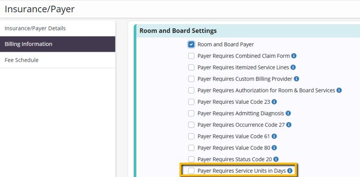 On the Billing Information tab, select Room and Board Payer and Payer Requires Service Units in Days under Room and Board Settings.
