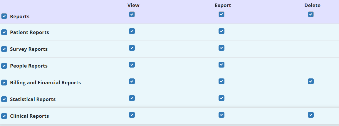 People tab ➜ People Center ➜ Edit ➜ Permissions tab ➜ Reports section ➜ Clinical Reports ➜ View/Export ➜ Save