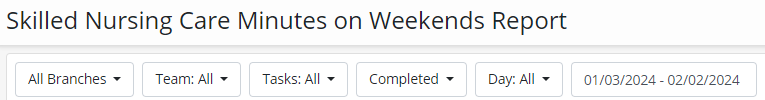 Reports tab ➜ Report Center ➜ Clinical Reports ➜ Skilled Nursing Care Minutes on Weekend Report
