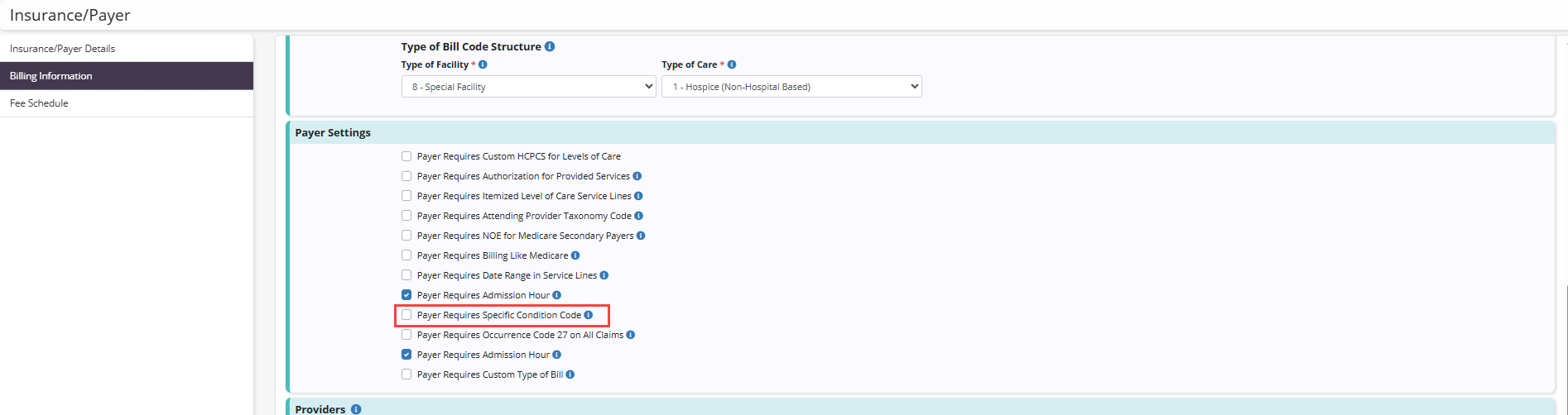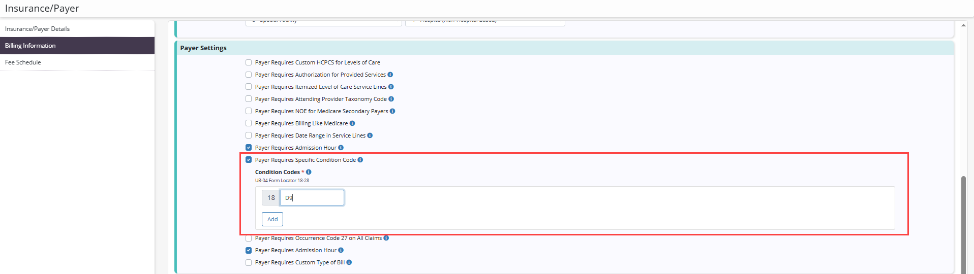 To enable this setting for a non-default payer, navigate to the Billing Information tab in the payer’s setup. In the Payer Settings section, select Payer Requires Specific Condition Code. Note: This setting is only available for payers with an institutional bill type.