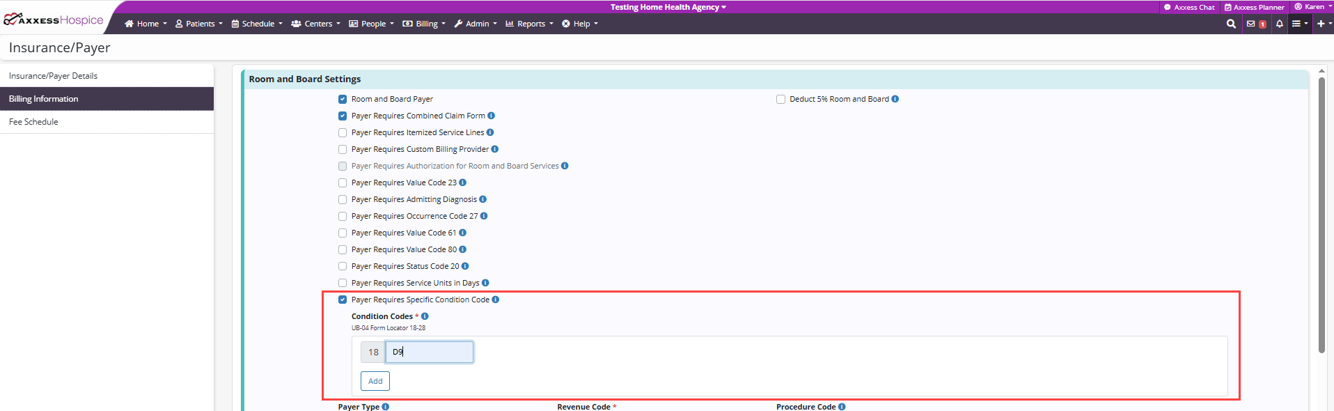 Axxess Hospice now provides a Payer Requires Specific Condition Code setting in the Payer Settings section for non-default payers with institutional bill types. Users can enable this setting to automatically capture up to three defined condition codes in UB-04 form locator 18, streamlining billing operations and reducing manual entry errors.
