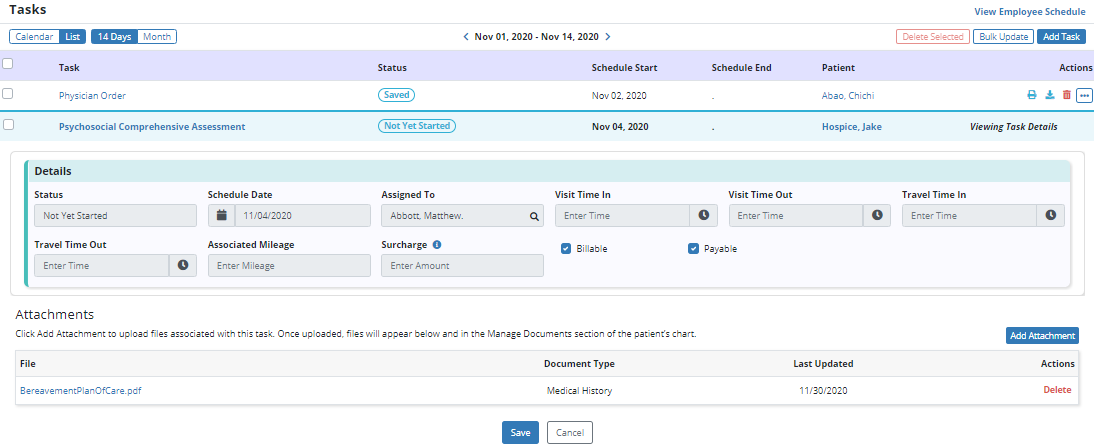 Axxess Hospice now enables users to view and manage details for scheduled tasks. This feature streamlines operations through a simplified task management process and facilitates compliance by enabling users to customize the billable and payable status of each task.
