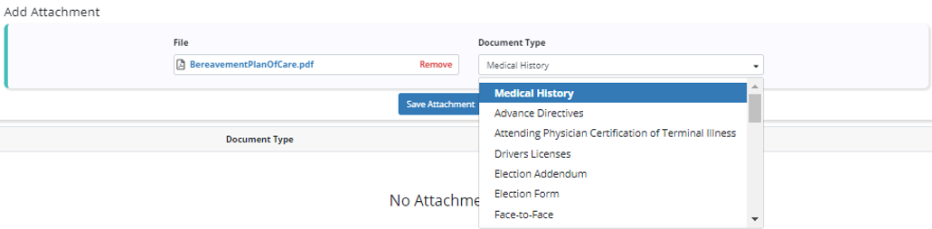 To add an attachment, click Add Attachment and select Choose File to upload the file from your device. Select a document type to classify the attachment and click Save Attachment.