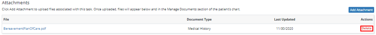 Any files removed from a task will also be removed from the Manage Documents section of the patient’s chart.