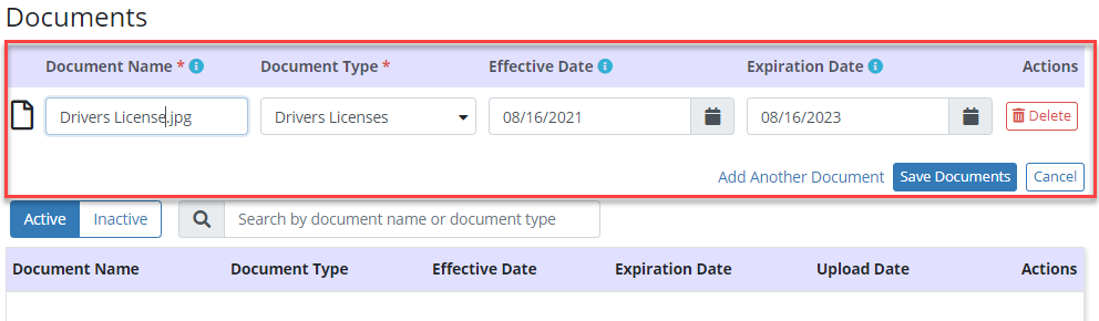 Upload the document from your device, select a document type, and enter an effective date and expiration date for the document.