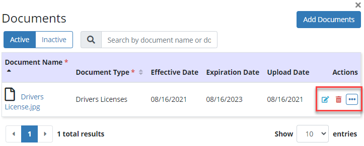 To reactivate a document, navigate to the Inactive list by selecting Inactive at the top of the Documents screen. Select the three-dot icon under Actions and click Reactivate.