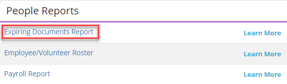 Users with permission to view people reports can now generate the Expiring Documents Report in the Report Center. To generate this report, navigate to the Report Center under the Reports tab. In the People Reports section, select Expiring Documents Report.