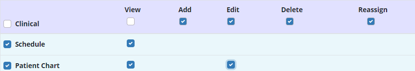 To give a user permission to edit information in the Patient Charts, edit the user and navigate to the Permissions tab. Scroll to the Clinical section and check the box under Edit next to the Patient Chart permission.