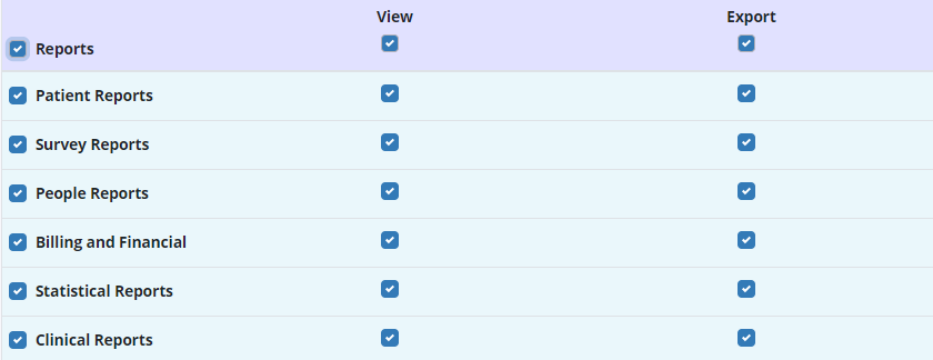 To give a user permission to view and export reports in the Report Center, edit the user and navigate to the Permissions tab. Scroll to the Reports section and check the boxes under View and Export next to the appropriate reports. Without permissions enabled, users cannot view or export any of the reports in the Report Center.