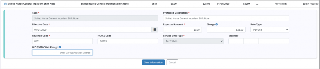 In the GIP Q5006/Visit Charge field, enter a per-visit amount if the task is used for services provided in an inpatient hospice facility under the GIP level of care. Note: If this field is left blank and the task is performed under the inpatient hospice facility or GIP, the charge for the task will default to the Per 15 Min charge for each visit unit.