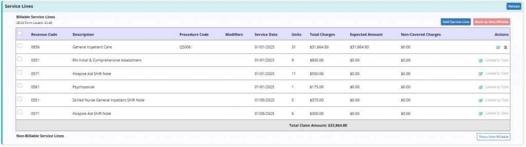 When the claim is generated, the tasks will be grouped by revenue code, week and will be displayed with the per visit unit and total charges. If multiple tasks are performed under the same revenue code with differing task descriptions, the solution will use the description of the first task of the week.