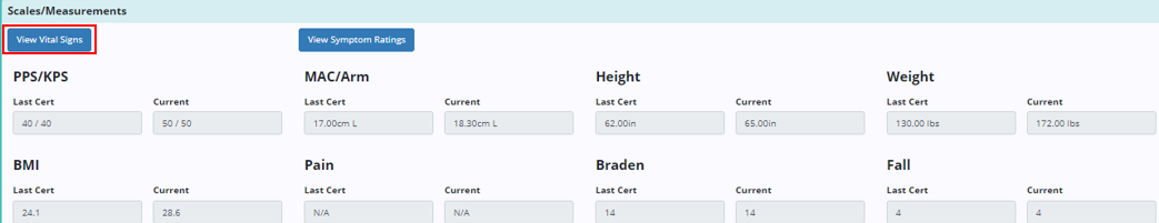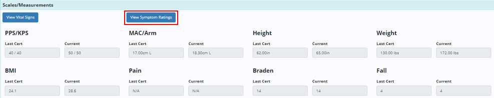 When selecting View Vital Signs or View Symptom Ratings from within a clinical document, the associated log will open in a new browser tab. Users can edit or delete an entry from the log by selecting the edit or delete icons from the Actions column.
