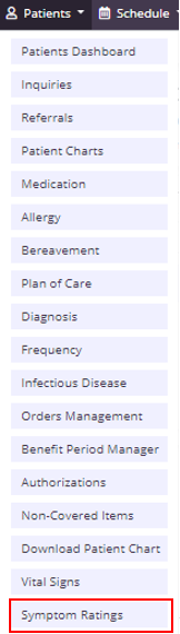 To access the symptom ratings log, select Symptom Ratings from the Patients tab, or navigate to the patient’s chart and select Symptom Ratings from the Quick Links menu.