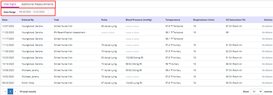 Select a date range from the filter at the top of the log or click the Vital Signs or Additional Measurements tabs to view the desired data.