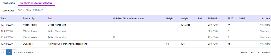 Additional measurements, including mid-arm circumference (cm), height, weight, BMI, PPS/KPS, FAST and NYHA will also be logged when documented during patient visits and will appear on the Additional Measurements tab in the log.