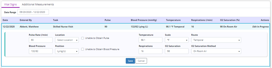 Vital signs that are documented as unable to be obtained will be indicated as such in the log. Additionally, any vital signs that are not documented during a visit will be blank in the log.