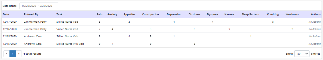 The symptom ratings log displays the patient’s documented symptom ratings and pain scores for the last 90 days. To see more or less data, select a different date range from the filter at the top of the log.