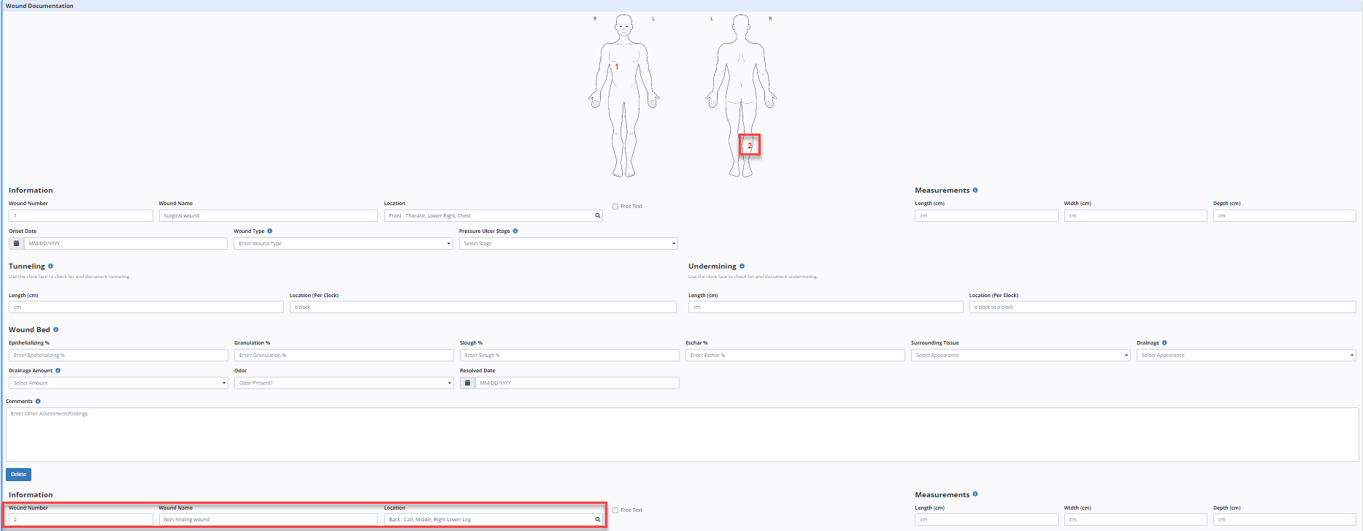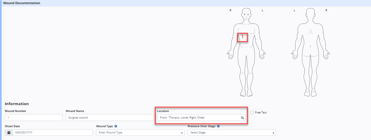 When a location is selected from the Location menu, a wound number will plot on the body diagram.