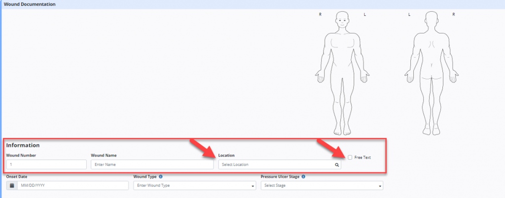 Complete the fields under Information. The wound number will populate automatically. Enter the wound name and select a location from the Location menu or select Free Text to type out the wound location.